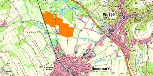 Die Grundstücke liegen derzeit im bauplanungsrechtlichen Außenbereich in ca. 450m Entfernung nördlich des Ortszentrums Neuenmarkt und ca. 1200 m westlich der Nachbarkommune Wirsberg.